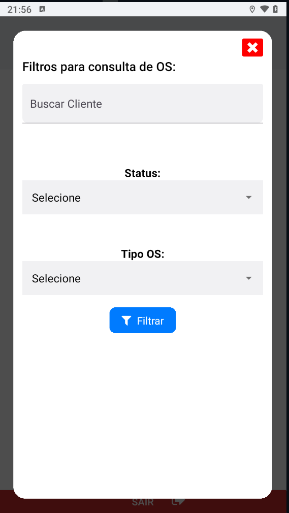 Nessa tela, o usuário terá opção de filtrar a OS através de um cliente, filtrar por Status ou pelo tipo da OS, caso o usuário deseja listar todas as OS's disponíveis para o mesmo, basta clicar em "Filtrar" sem selecionar nenhuma opção.